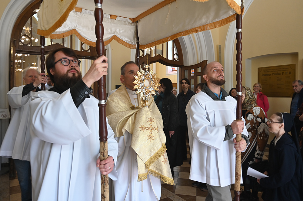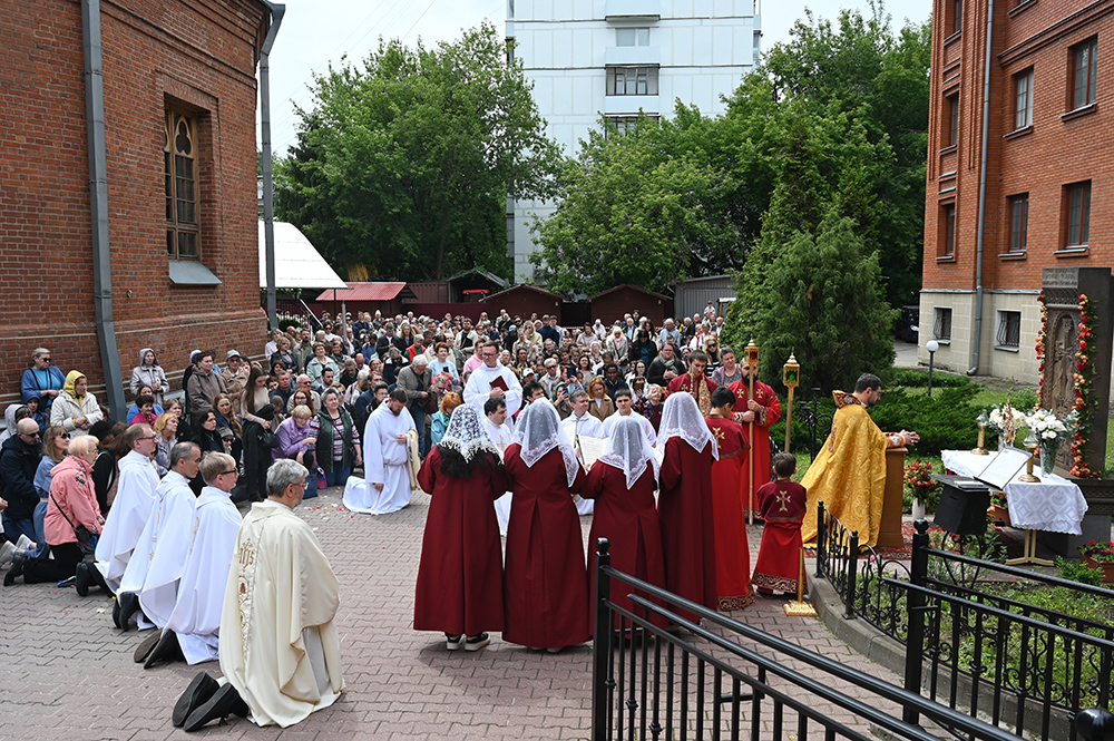 22 июня верующие московских католических приходов собрались в Кафедральном соборе Непорочного Зачатия Пресвятой Девы Марии, чтобы отпраздновать торжество Пресвятых Тела и Крови Христа Святой Мессой под предстоятельством генерального викария Архиепархии свящ. Кирилла Горбунова и общеприходским Крестным ходом с Пресвятыми Дарами по территории собора.