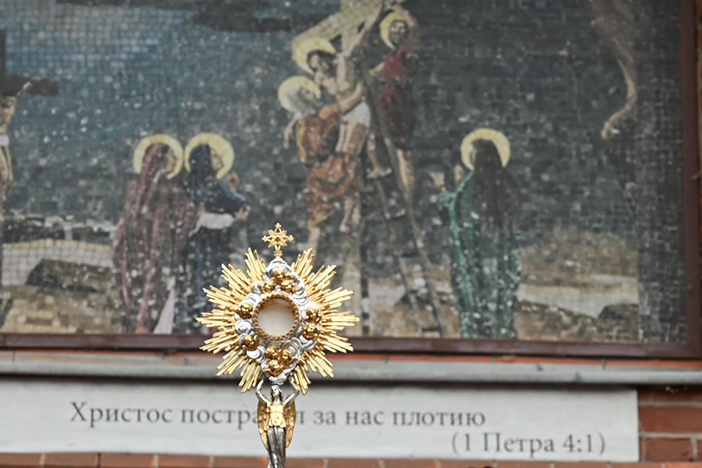 Отец Кирилл отметил глубокий смысл процессии с Пресвятыми Дарами, которая будет совершаться после окончания Святой Мессы: «Это символ того, что Евхаристия сопровождает нас в каждом шаге нашей повседневной жизни. Евхаристия не заканчивается только Таинством у алтаря, только лишь Причащением и каким-то особенным состоянием благодати, которое мы стараемся изо всех сил сохранить, но быстро теряем, когда выходим из храма и погружаемся в обычную житейскую суету. Нет! Евхаристия продолжается в терпении, в прощении, во внимании, которое мы оказываем другим людям, в готовности принимать их, и главное – в готовности идти на риск и поделиться чем-то, что у нас есть и о чем мы так отчаянно боимся, что нам самим не хватит, приберегая это для себя и для самых близких людей. Боимся растратить на кого-то постороннего, а между тем именно эти люди, которые кажутся нам посторонними, и есть те, кого Бог посылает нам навстречу, чтобы в нас они видели присутствие Бога и Его заботу о себе».