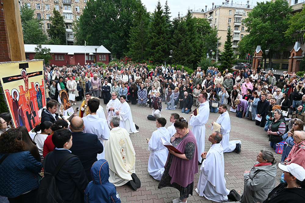 По окончании Святой Мессы верующие совершили Евхаристическую процессию по территории храма. Останавливаясь у четырех стояний-алтарей, подготовленных членами московских приходов и общин, участники процессии совершали краткую молитву, слушали отрывки из Евангелия и размышляли над ними.