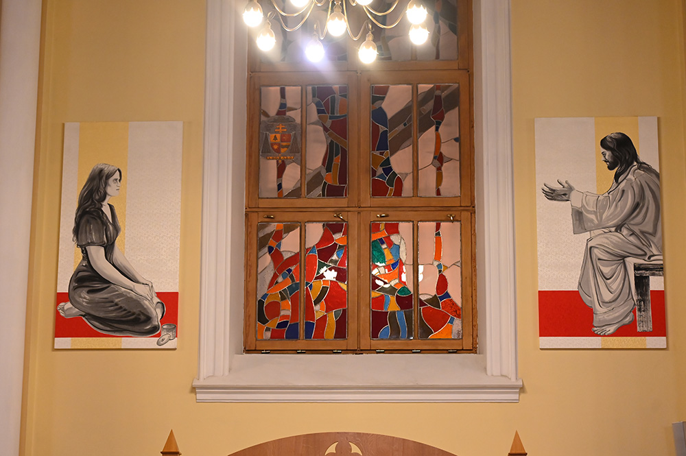Они изображают Иисуса Христа и Марию Магдалину с сосудом с драгоценным миром, которым, как говорит нам Евангелие и традиция Церкви, она помазала ноги Господу, омыв их слезами. Как сказал владыка перед освящением полотен, «они привлекают наше внимание к тому, что происходит в конфессионале, а именно – к покаянию и прощению. <…> А образ Марии Магдалины сопровождает всех тех, кто подходит к исповедальне».