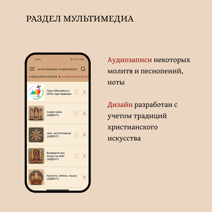 • Более 300 католических молитв и 500 песнопений (включая Гимн Юбилейного 2025 года Надежды) на каждый период литургического года;