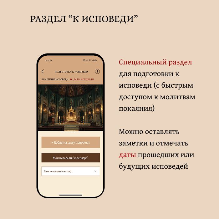 • Специальный раздел для подготовки к исповеди: быстрый доступ к необходимым молитвам, возможность делать заметки и отмечать дату прошедшей/предстоящей исповеди;