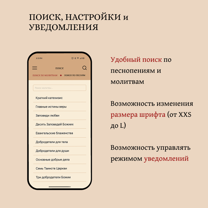 • Возможность добавлять молитвы в Избранное, изменять размер шрифта и включать уведомления о праздниках и памятных датах в разных режимах;
