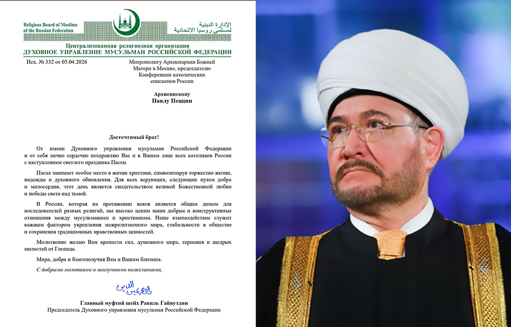 Архиепископа Павла Пецци и вместе с ним — всех католиков Российской Федерации со светлым Пасхальным торжеством поздравил Председатель Духовного управления мусульман главный муфтий шейх Равиль Гайнутдин.
