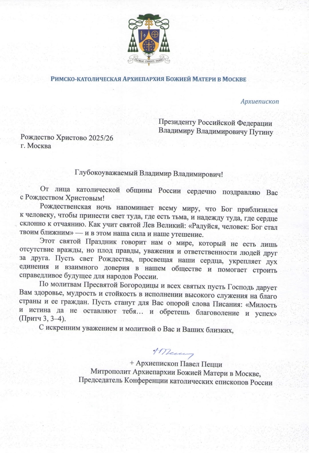 Владыка Павел поздравил президента от лица католической общины России и пожелал, чтобы свет Рождества укреплял дух единения и взаимного доверия в нашем обществе и помогал стоить справедливое будущее для народов России. Архиепископ также отметил, что «этот святой Праздник говорит нам о мире, который не есть лишь отсутствие вражды, но плод правды, а уважения и ответственности людей друг за друга».