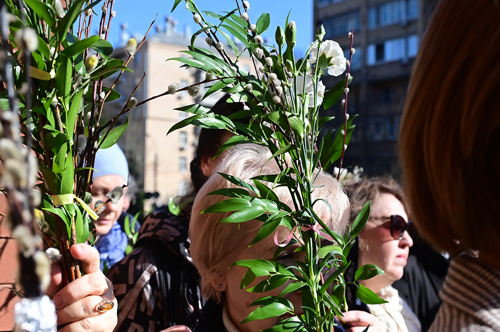 Торжественное богослужение Вербного воскресенья по традиции начинается на улице возле храма, где предстоятель освящает ветви вербы и пальмы.